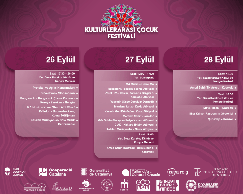 Atölyelerde edindikleri deneyimleri sahneye taşıyacak olan çocuklar ve gençler, düzenlenecek olan Çocuk ve Gençlik Festivali’nde kültür-sanatın farklı dallarındaki üretimlerini sergileyecekler. Festivalimiz, çok kültürlülük ekseninde kültürel çeşitliliği destekleyen ve güçlendiren bir felsefeyle, çocukların ve gençlerin öncülüğünde inşa edilecektir.